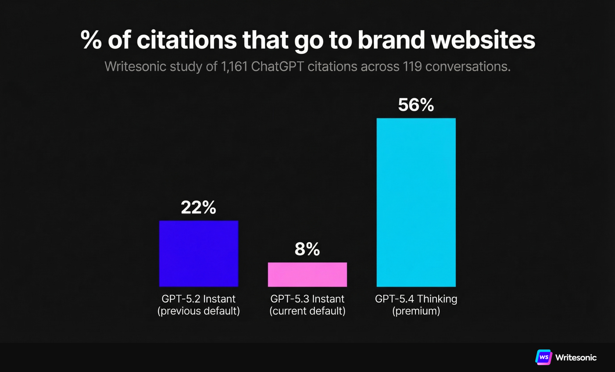 A study testing 50 prompts across ChatGPT’s newest models found a stark difference in how they cite sources. GPT-5.3 Instant (the current default for most users) sends a single broad search query and pulls results mainly from third-party review sites like Forbes, TechRadar, and Reddit — only 8% of its citations go to brand websites directly. GPT-5.4 Thinking (the premium model) breaks each prompt into an average of 8.5 sub-queries, visits brand websites directly, and sends 56% of citations to first-party brand pages.